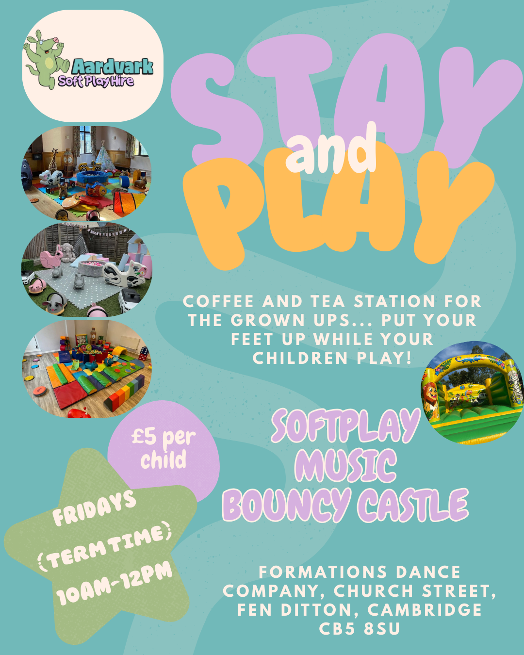 £5 per child for 2 hours of playing with Soft play, toys, bouncy castle and music... plus a drinks station for the parents so you can pop your feet up while your little ones explore, learn and play!